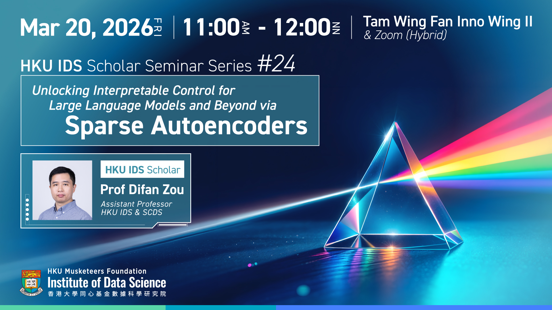 Professor Difan Zou is an Assistant Professor in HKU IDS & Computer Science, School of Computing and Data Science, at The University of Hong Kong. He received his Ph.D. in Computer Science, University of California, Los Angeles (UCLA). He received a B. S degree in Applied Physics, from School of Gifted Young, USTC and a M. S degree in Electrical Engineering from USTC. He has published multiple papers on top-tier machine learning conferences including ICML, NeurIPS, ICLR, COLT, etc. He is a recipient of Bloomberg Data Science Ph.D. fellowship. His research interests are broadly in machine learning, optimization, and learning structured data (e.g., time-series or graph data), with a focus on theoretical understanding of the optimization and generalization in deep learning problems.